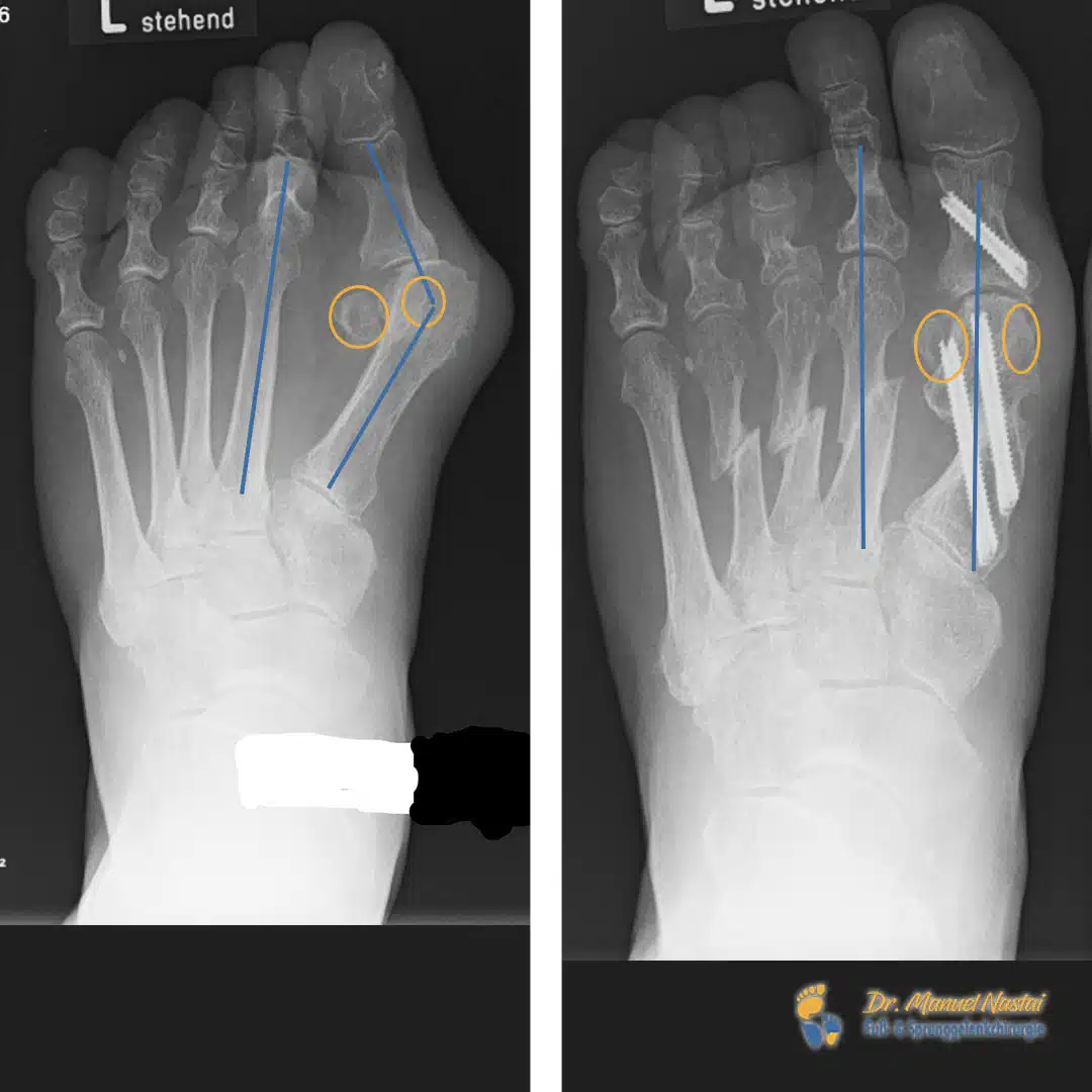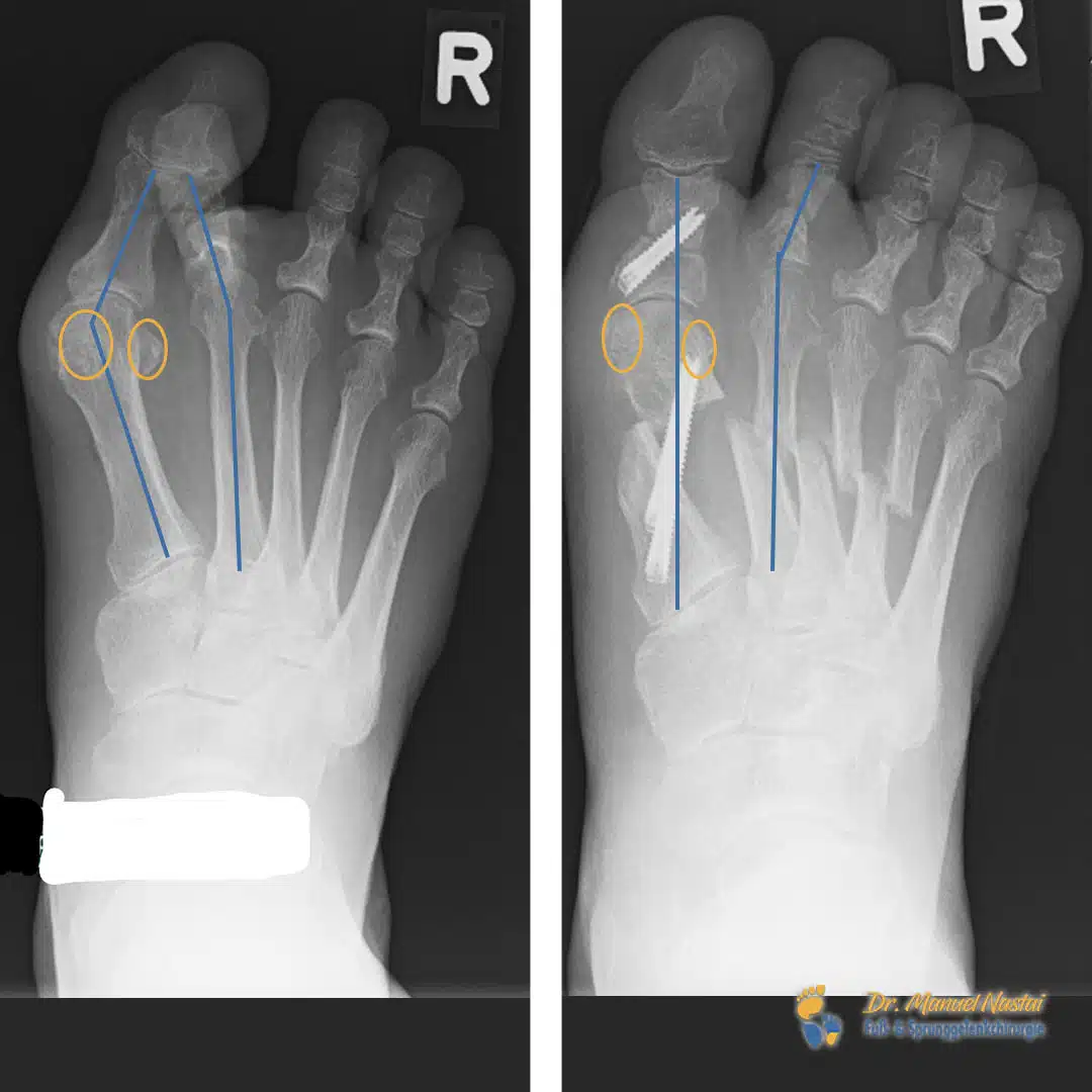 Links (präoperativ): Deutlicher Hallux valgus mit vergrößertem Intermetatarsalwinkel IMA 1–2 (blaue Linien markieren die Längsachsen von M1 und M2; die Spreizung ist klar erweitert). Die Sesambeine unter dem Großzehengrundgelenk (orange markiert) sind nach lateral verlagert und liegen nicht mehr zentral unter dem Metatarsalköpfchen – Ausdruck der Subluxation im MTP-I. Zusätzlich zeigt sich ein Hochstand / Beugerfixation der 2. Zehe: der 2. Strahl steht in Fehlstellung, was zur Überlastung/Transfermetatarsalgie neigt.