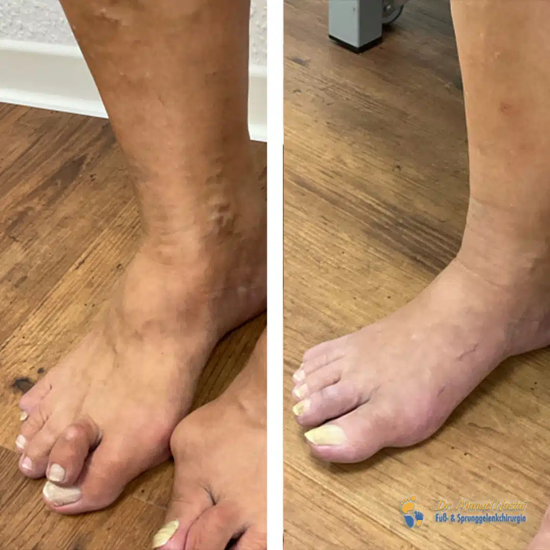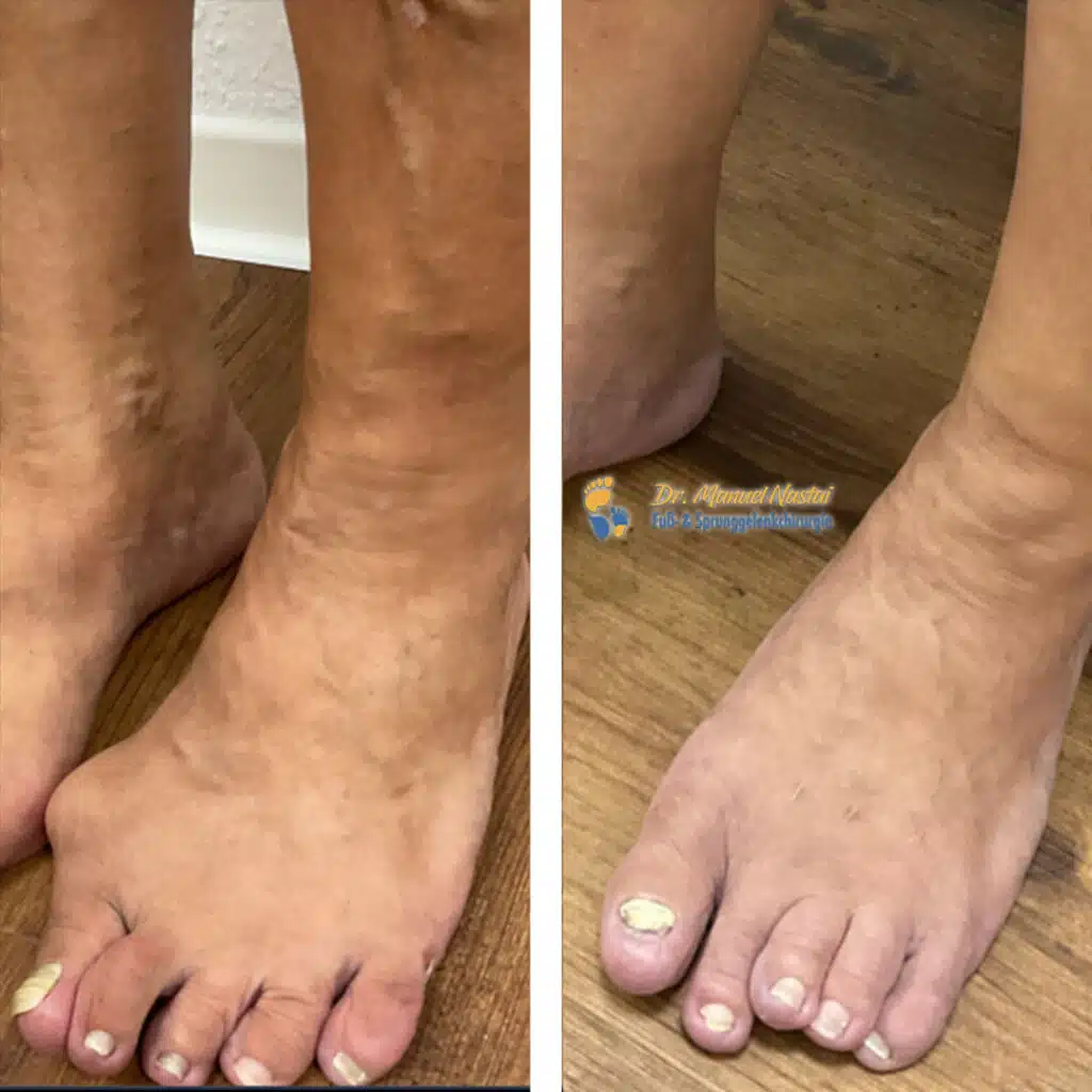 Nach etwa 3 Monaten zeigte die Radiologie ein fortgeschrittenes knöchernes Durchbauungsstadium; klinisch waren die Zehen gerade, nebeneinander, ohne Konflikt. Die Patientin berichtete über deutliche Beschwerdelinderung, verbesserte Schuhfähigkeit und belastungsarmes Gehen. Der Ballen („Bunion“) war behoben, eine prominente Vorwölbung bestand nicht mehr.