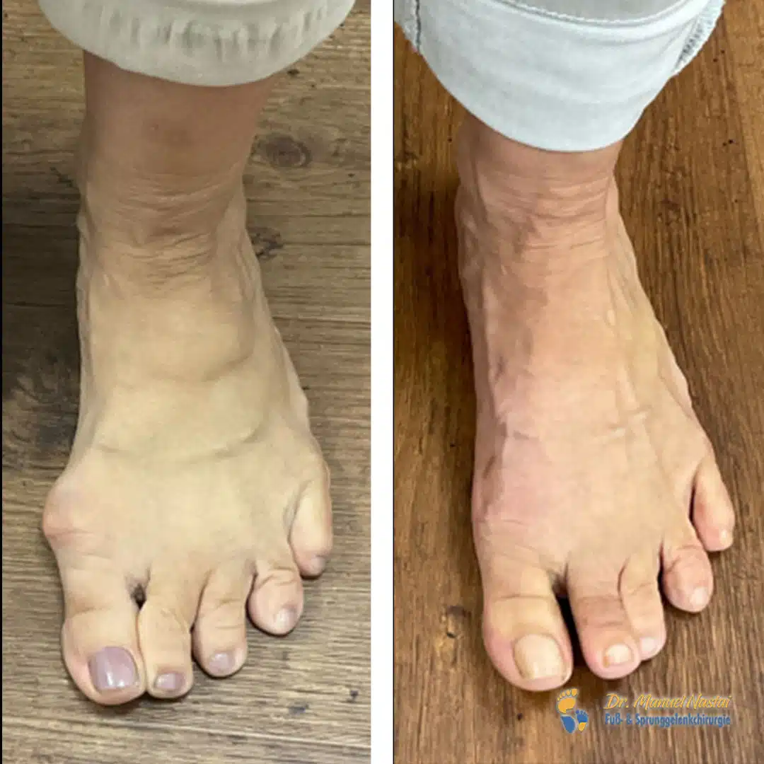 Kontrollaufnahmen zeigten einen deutlich reduzierten IMR1‑Winkel, zentrierte Sesambeine und normalisierte Gelenkachsen siehe Röntgenaufnahme Vorher Nachher. Klinisch präsentierte sich der zweite Zeh gerade und konfliktfrei dokumentierten kaum sichtbare Narben bei nur geringer Restschwellung siehe Vorher Nachher Bilder unten.