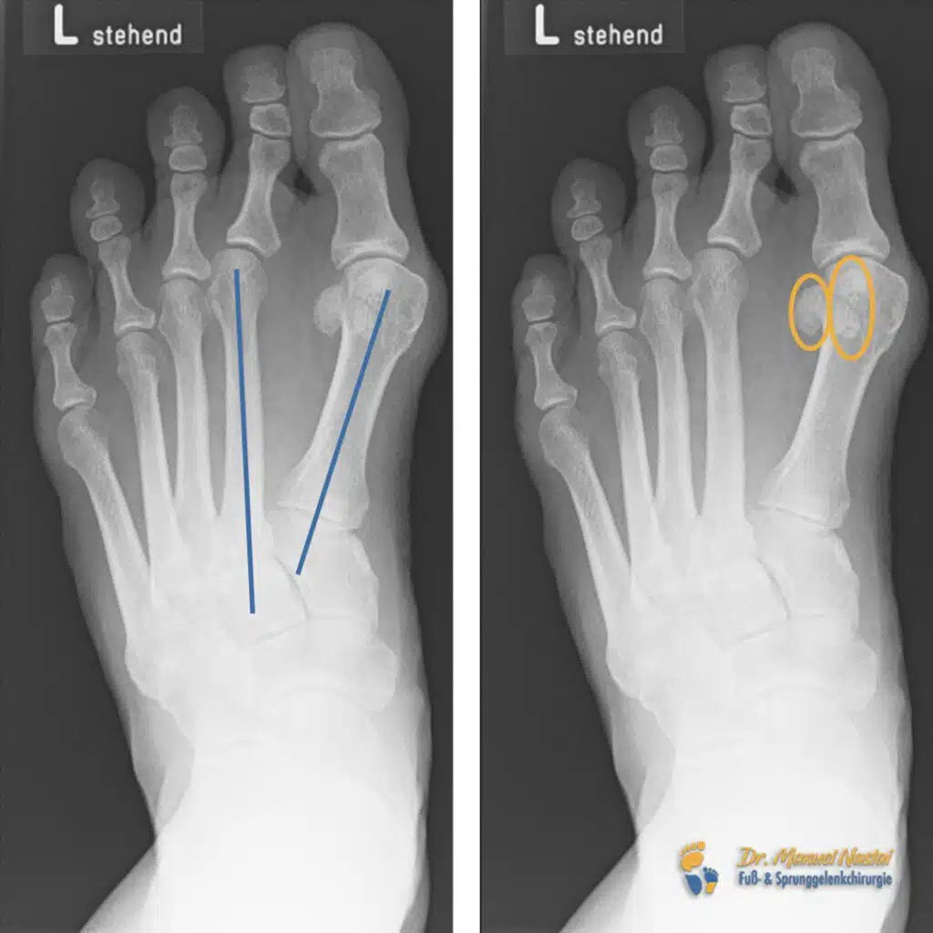 Der Hallux valgus (https://www.drnastai.de/minimalinvasive-hallux-valgus-operation/) ist eine Fehlstellung der Großzehe, bei der diese zunehmend zur Fußaußenseite abweicht. Gleichzeitig wölbt sich das Köpfchen des ersten Mittelfußknochens zur Fußinnenseite hervor (siehe Blaue Linie rechts). Diese Veränderung kann zu Schmerzen, Druckstellen und einer eingeschränkten Gehfähigkeit führen. Ursache sind häufig genetische Veranlagung, schwaches Bindegewebe oder ungeeignetes Schuhwerk. Anfangs kann die Fehlstellung mit Schienen oder Einlagen behandelt werden – bringt dies keine ausreichende Linderung, ist eine operative Korrektur notwendig. Dabei wird die Fehlstellung am Knochen selbst korrigiert. Besonders vorteilhaft sind minimalinvasive Methoden, bei denen über kleinste Schnitte gearbeitet wird, um die Funktion des Fußes wiederherzustellen – ohne große Narben oder lange Ausfallzeit.