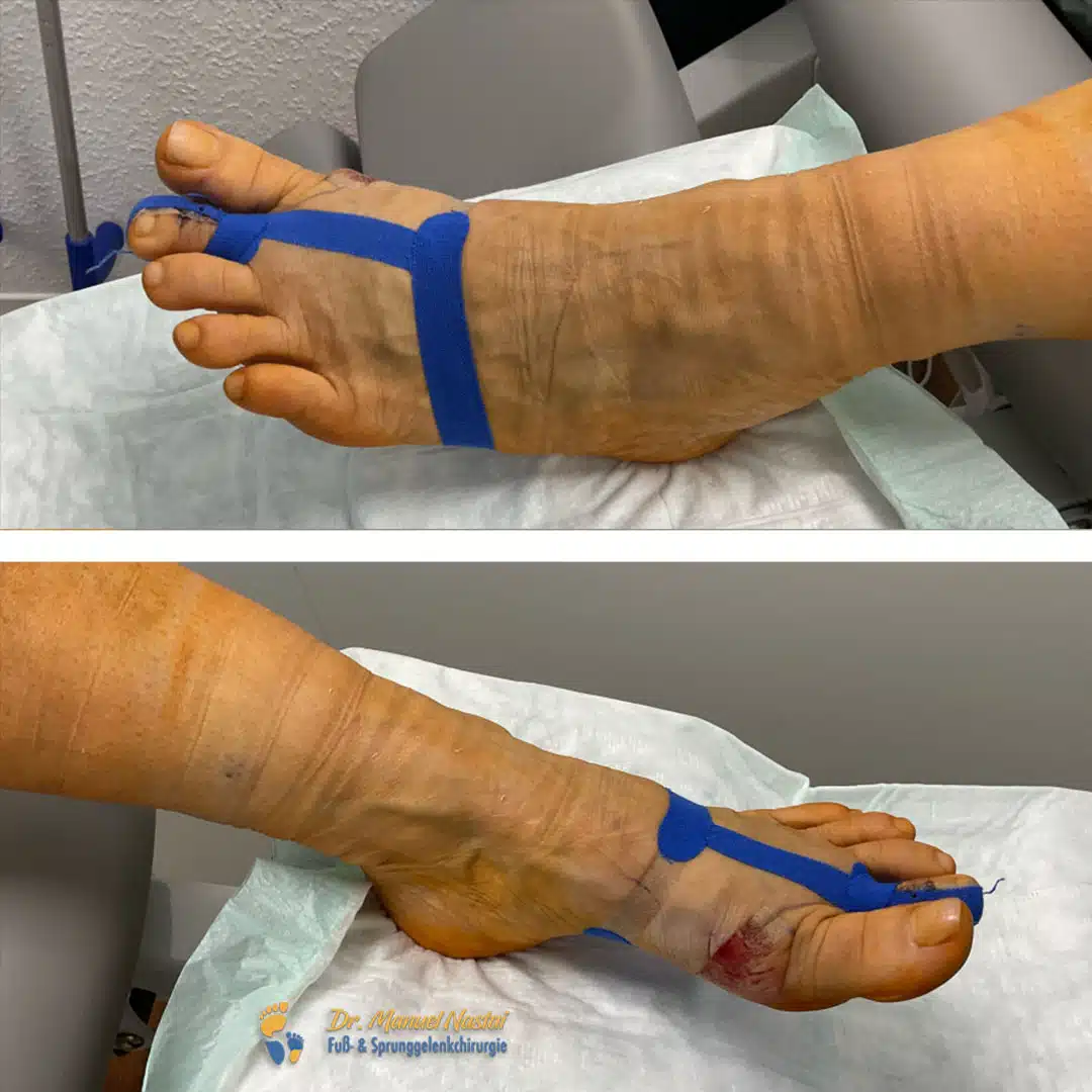 Am zweiten Zeh setzen wir auf eine schonende Fixation mit Tape-Verbänden – ohne zusätzliche Drahtfixation. Ziel ist es, den natürlichen Fußaufbau wiederherzustellen und schmerzhafte Konflikte nachhaltig zu vermeiden.